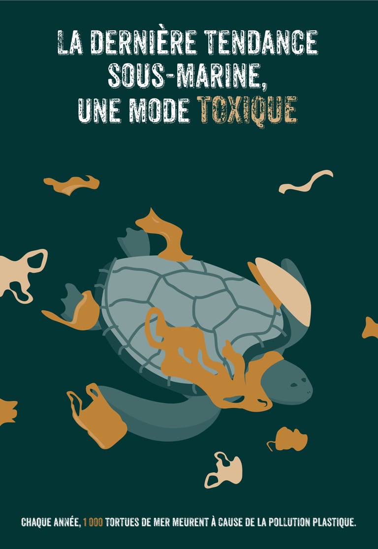 Affiche de sensibilisation dénonçant l’impact mortel de la pollution plastique sur les tortues de mer à travers une métaphore de la mode.